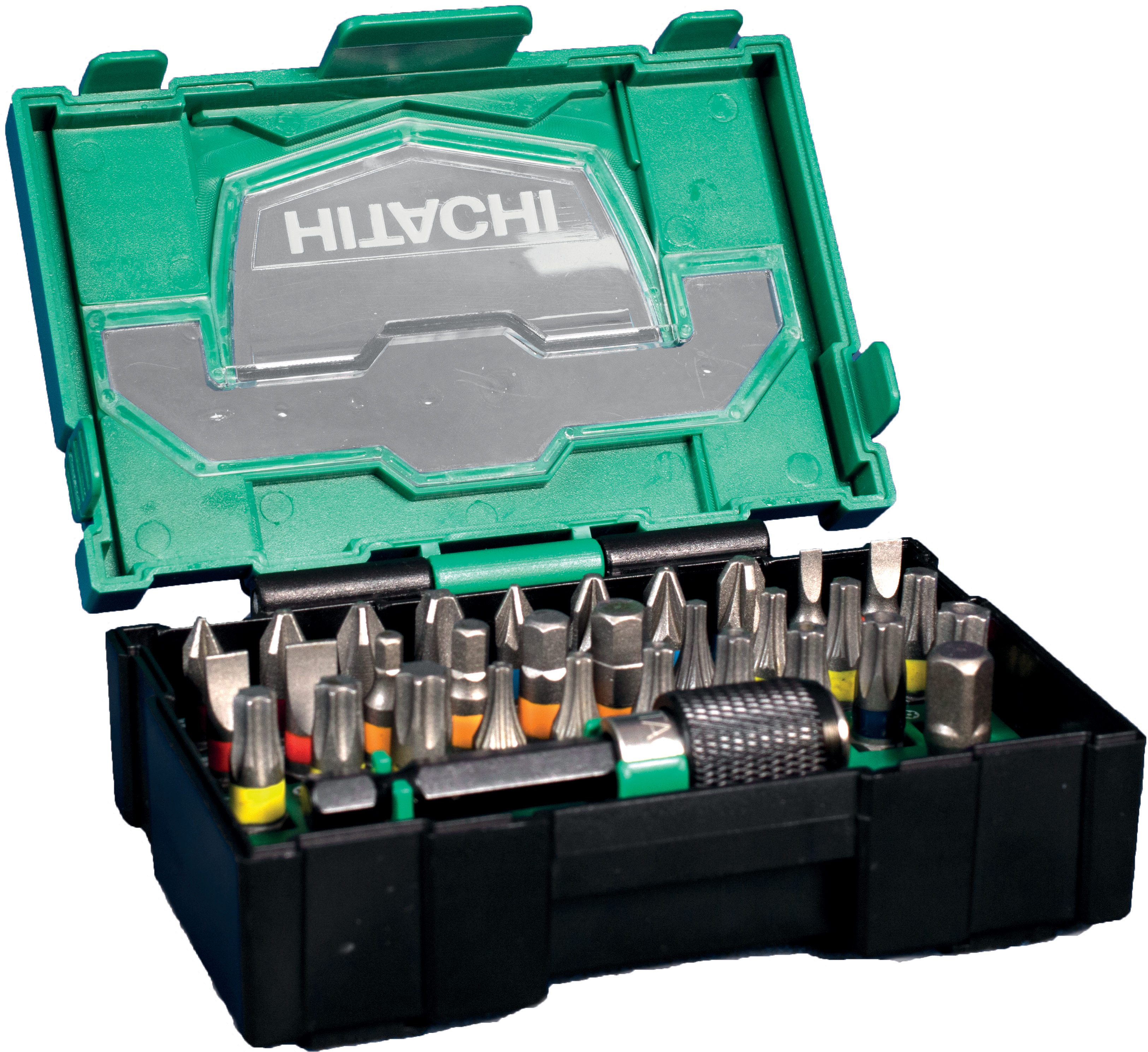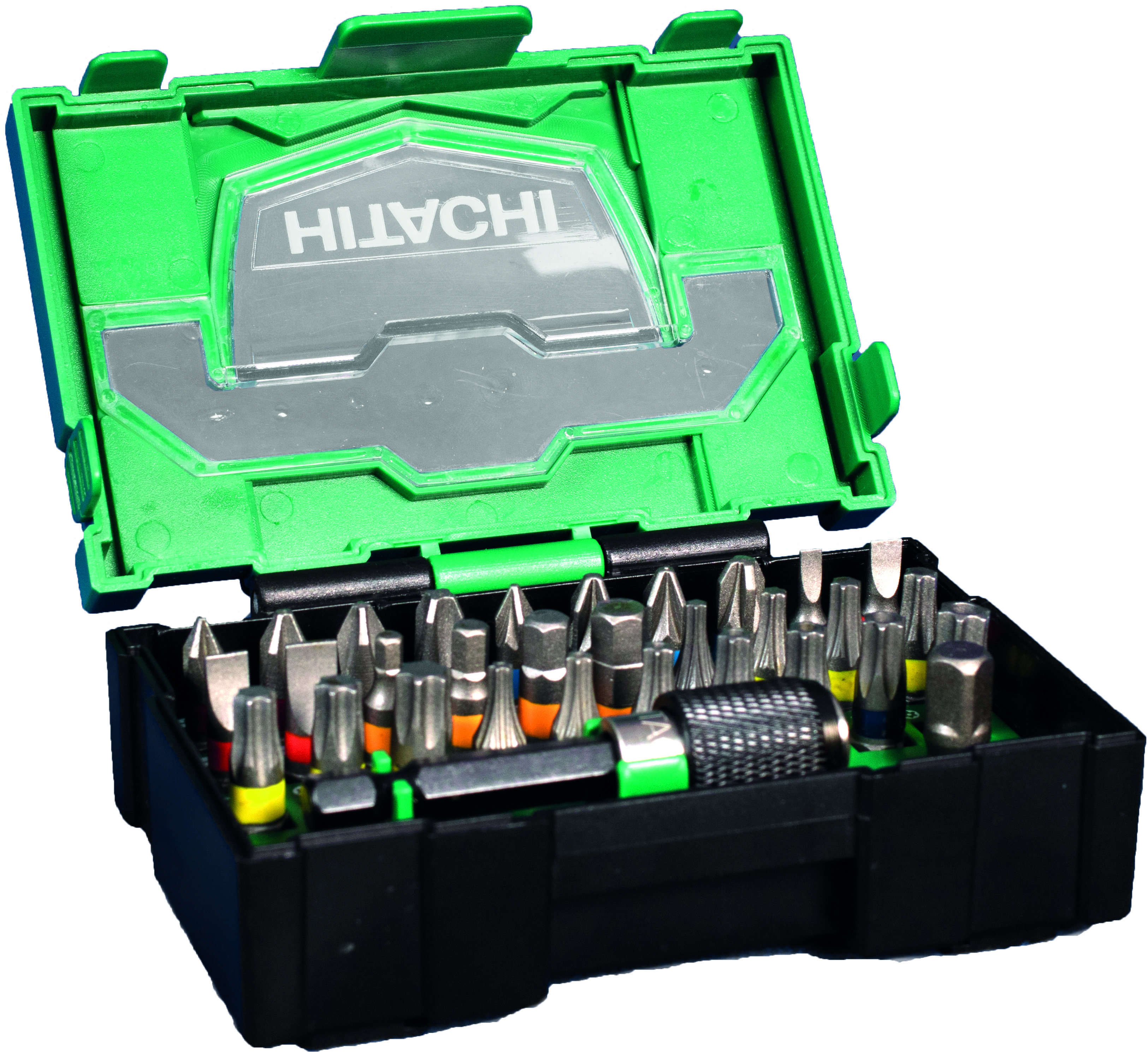 PH1, 2xPH2, PH3, Lige kærv 3, 4, 5, 6 mm, H3, H4, H5, H6, T10, T15, T20, T25, T27, T30, T40, TT10, TT15, TT20, TT27, TT30, TT40, PZ1, 2xPZ2, PZ3, bitsholder og overgang 1/4” sekskant til 1/4” firkant