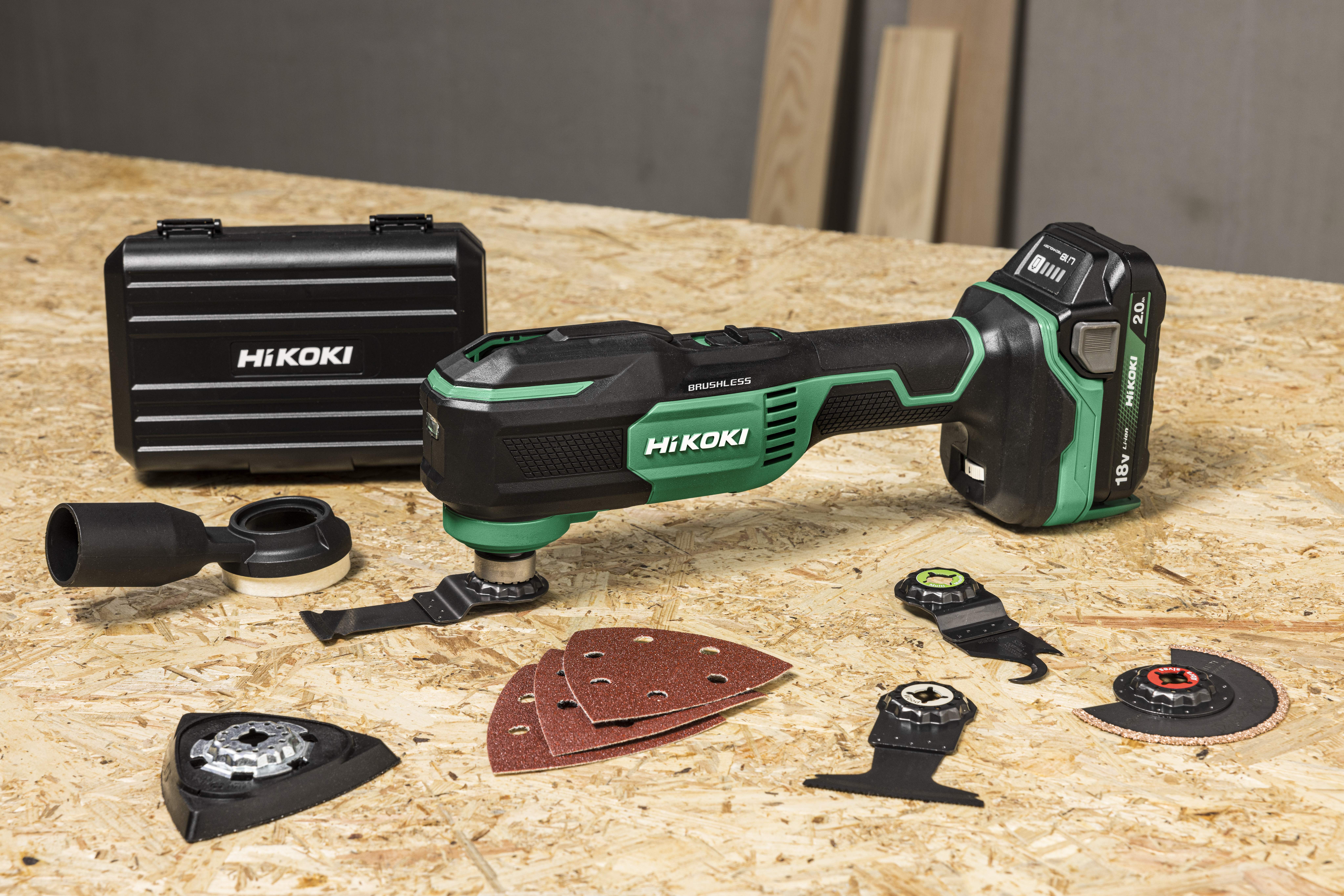 Leveres i stablekoffert (HSC2) med 2 stk 2,0 Ah Li-ion batterier, hurtiglader, multiverktøyblad, slipeplate, 10 stk sandpapir (K80, K120) og støvavsugsadapter i tilbehørsboks.