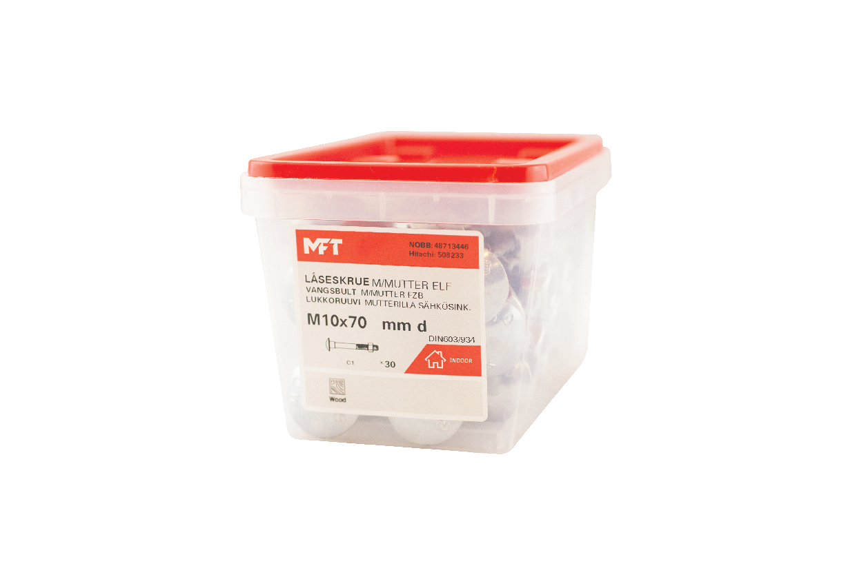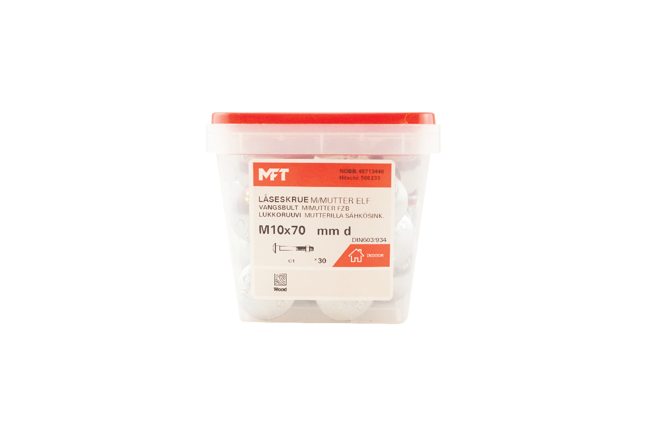 MFT Låseskrue med mutter brukes for sammenskruing av trestendere, platematerialer mot underlag av tre eller stål. Under det kuppelformede hodet er det en firkant som fungerer som en låsing i det mykere materialet da sammenskruing skjer. For innendørs bruk.
