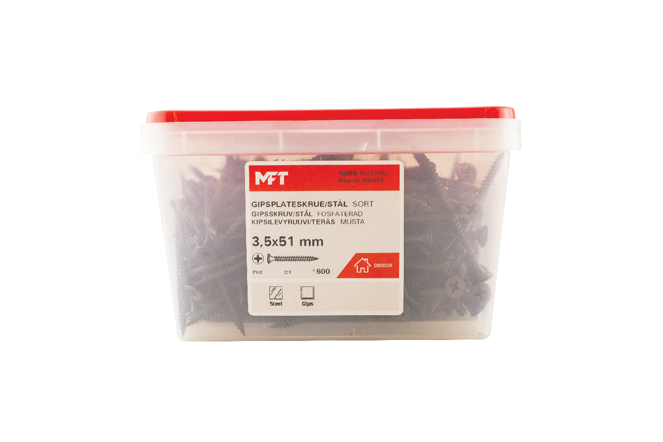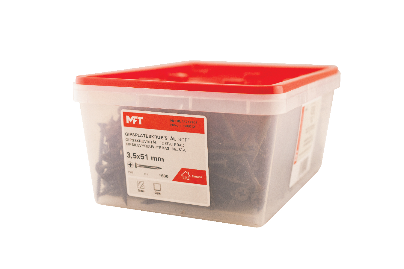 MFT gipsplateskrue sortfosfat for feste av gipsplater mot stålrigler. Anbefalt 20 - 30 skruer/m2. For innendørs bruk.