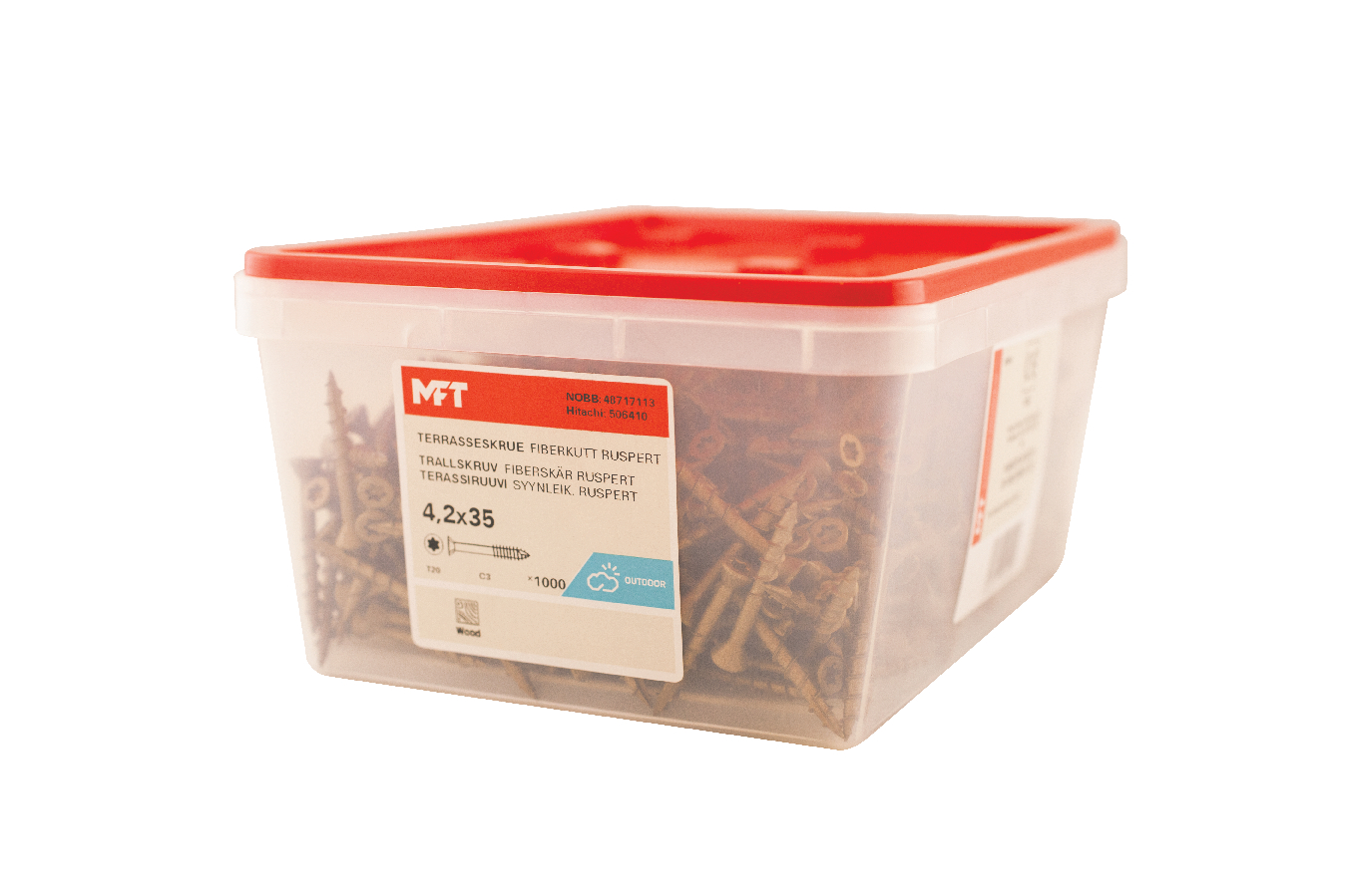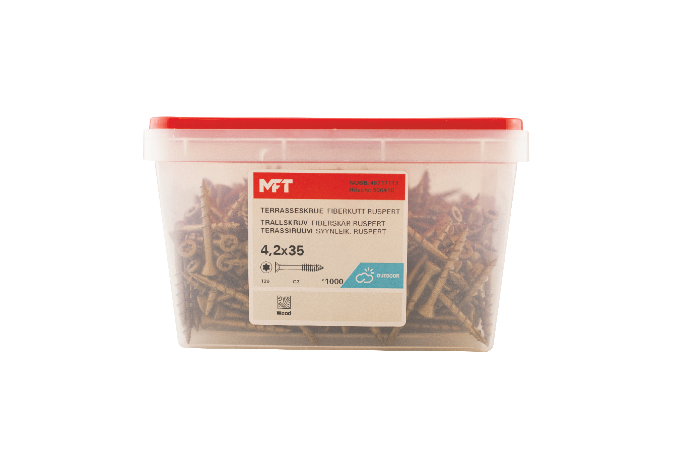 MFT 1000 Ruspert Terrasseskrue til bruk i vanlig trykkimpregnerte terrassebord mot underlag av trevirke. Korrosjonsklasse C3 - for utendørs bruk. Ved aggresive miljøer som kystnært, hav og salt anbefales alltid rustfritt A2 eller syrefast A4 kvalitet.