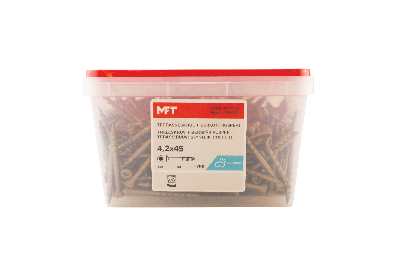 MFT 1000 Ruspert Terrasseskrue i herdet stålkvalitet - kvalitet AISI-1022. Korrosjonsklasse C3, utvendig behandlet med med 3 lag, keramisk - kjemisk og sink. Testet 1.000 timer i salttåkekammer (MFT 1000). Selvborende og selvforsenkende skrue for utvendig bruk med Tx20 bitsspor.
