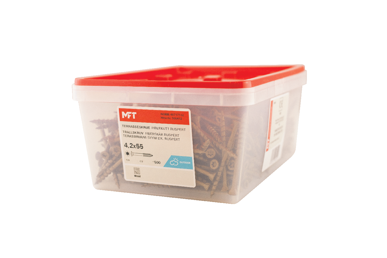 MFT 1000 Ruspert Terrasseskrue til bruk i vanlig trykkimpregnerte terrassebord mot underlag av trevirke. Korrosjonsklasse C3 - for utendørs bruk. Ved aggresive miljøer som kystnært, hav og salt anbefales alltid rustfritt A2 eller syrefast A4 kvalitet.