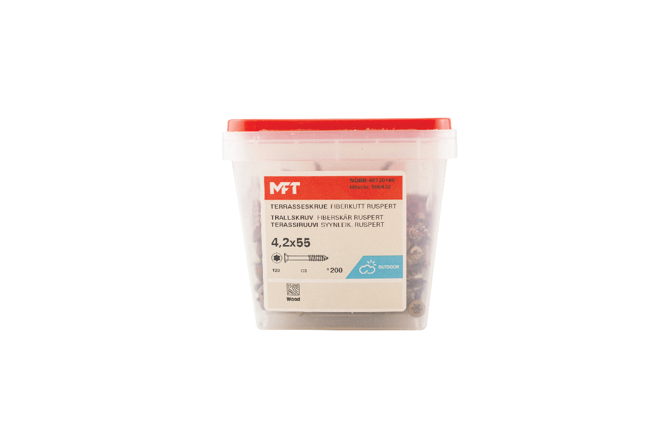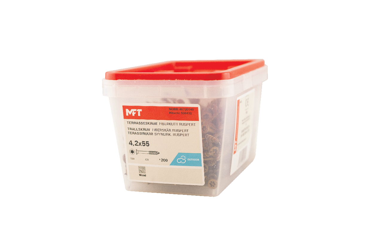 MFT 1000 Ruspert Terrasseskrue i herdet stålkvalitet - kvalitet AISI-1022. Korrosjonsklasse C3, utvendig behandlet med med 3 lag, keramisk - kjemisk og sink. Testet 1.000 timer i salttåkekammer (MFT 1000). Selvborende og selvforsenkende skrue for utvendig bruk med Tx20 bitsspor.