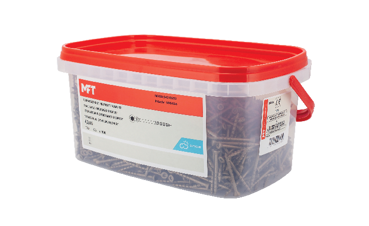 MFT 1000 Ruspert Terrasseskrue til bruk i vanlig trykkimpregnerte terrassebord mot underlag av trevirke. Korrosjonsklasse C3 - for utendørs bruk. Ved aggresive miljøer som kystnært, hav og salt anbefales alltid rustfritt A2 eller syrefast A4 kvalitet.